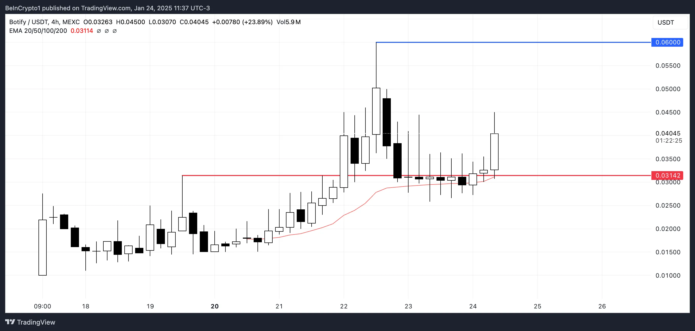 Если восходящий тренд сохранится, цена BOTIFY может превысить $0,050 и, возможно, протестировать $0,060. Однако потеря уровня поддержки $0,031 приведет к масштабной коррекции.